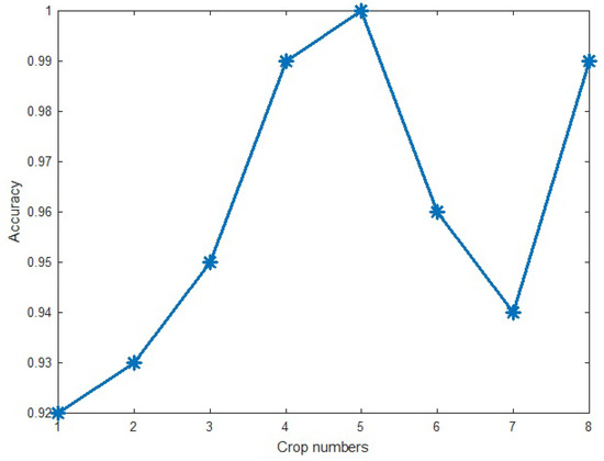 Using the five crops in the training of the proposed method increases not only the size of the dataset but also the robustness of the method in coping with the missed or destroyed parts of the input images. Selecting the suitable number of the crops was done by testing the different values and analyzing the accuracy of the proposed method on the training data. After testing different numbers of crops, the number five was used. Figure 13 shows the best-achieved accuracy of the proposed method in different crops of input images. As Figure 13 shows, while the accuracy of the proposed method monotonically increases in the crop numbers ranging from 1 to 5, the accuracy is approximately fixed in the higher values of the crop number. Due to decreasing of time and cost complexity, five crop numbers were selected.
