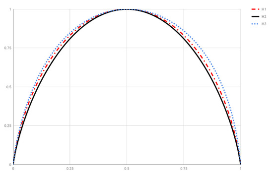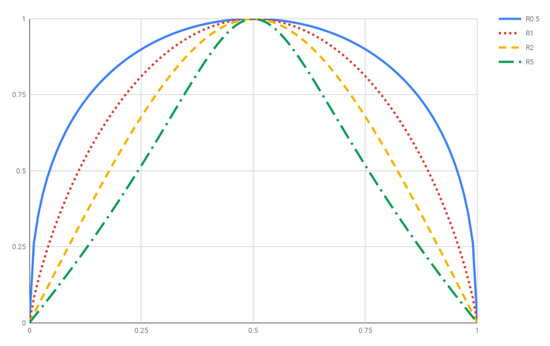 - is (strictly) ∩-convex for . Figure 1 plots for , 1, 2 and 5. Let us mention in passing that is ∪-convex for .