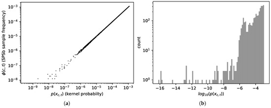 (a) (left)— Sample frequencies converge to kernel probabilities , as defined in Equation (8). This plot compares them after bootstrap cycles of SPSb (with , i.e., sampled analogues). The values, as expected, start to visibly diverge around ; (b) (right)— Histogram of the probabilities assigned by the kernel to all analogues on the plane, for a typical prediction. It can be seen that a sizeable proportion of the analogues has probability e.g., . They will therefore not be included in SPSb if the number of analogues sampled is of order .