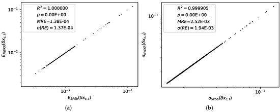 We again omitted normalization terms in the third and fourth rows. This equation, combined with Equation (11), means that the standard deviation calculated with NWKR is espected to be proportional to the standard deviation calculated with SPSb multiplied by . Note that this method makes it possible to estimate any moment of the distribution, not just the second.