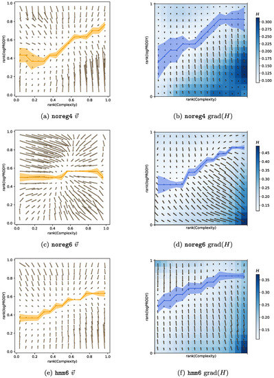Comparison of the CL model of motion on the different datasets used in this work. The horizontal axes mark the Complexity, and the vertical ones logPRODY. Note that in these figures we use tied ranking as coordinates, instead of the observed values directly. Panels (a,c,e) show the field, together with a kernel regression of the minima of the field across the vertical direction in yellow. An uncertainty measure of this minima line has been calculated by means of a bootstrap. Panels (b,d,f) show a heat map of the H field, and its gradient. The blue line indicates the minima of the H field along the vertical direction, together with an uncertainty calculated via bootstrap. The first feature of this Figure is the difference in the fields. The one calculated from noreg6 has much higher velocities on the Complexity axis, while the hmm6 velocities along the same direction are much smaller. This might be an indication that much of the change in Complexity over time is actually due to noise. The second feature is that, when going from 4 to 6 digit granularity, the observed minima lines become incompatible with those predicted by the model.