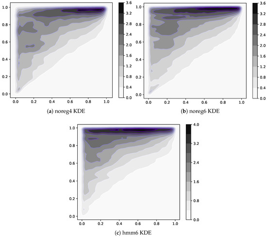 Comparison of matrices density for the 3 datasets used in this work. In each panel, we plotted one point for each nonzero element of each matrix in a dataset. Countries, ranked by increasing Fitness, are on the vertical axis, while products ranked by increasing Complexity on the horizontal axis. To be able to resolve the difference in the density of points, we applied a kernel density estimate (KDE). The triangular shape suggesting nestedness is clearly visible in all three cases. The differences lie in the top left corner, where low-Complexity products exported by high-Fitness countries are found. The unregularized data (noreg4, noreg6) notably have lower density here when compared with regularized matrices (hmm6). This is reflected in the increased nestedness of regularized matrices, as shown in Figure 6.