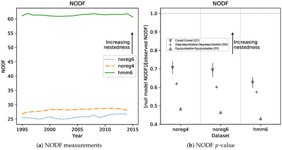 Complexity and Fitness measures were originally proposed [1] within the field of Economic Complexity (EC) to capture respectively the level of sophistication of a given class of products found on the international export market and the advancement of the productive system of a country. These two measures are calculated from international trade data, and they stem from the hypothesis that the difference between countries’ competitiveness comes from their respective capabilities [2,3,4]. Capabilities are non-exportable features of the productive system of a country that allow it to produce a certain class of products. The problem with the theory of capabilities is that capabilities themselves are hard to define: one can speculate on what they might be, e.g., good regulations, a well-organized education system, or maybe the presence of facilities specifically useful for a product’s making, but there is currently no good principled “a priori” or normative approach to classify and measure them [5]. On the other hand, the observation that a country c exports product p contains a strong signal. It implies that c is competitive enough in the production of p for export to be convenient on the global market. Therefore, one could say that c has all the capabilities needed to make p. Hausmann [6] proposed the Method of Reflections, a non-normative algorithm to rank countries by how many capabilities they have, and products by how many capabilities they need for production, based on observed exports. The algorithm leverages topological properties of the export network, which is a bipartite network where the nodes can be either countries or product classes, and where a link is added to the network if country c is a significant exporter of p. Fitness and Complexity are the output of an alternative algorithm [7] exploiting the discovery that the export network has a nested topology [1] (a comparative analysis is found in [8]). In other words, it has been observed that some countries, usually the richest in monetary terms, export almost all product classes, and some products are exported only by the countries that are most diversified in terms of export. Conversely, the less diversified countries only export a handful of products which are also being exported by almost all countries. This means that the adjacency matrix of the export network can be reordered to be very close to triangular, in analogy with some biological systems [9,10]. The Fitness/Complexity algorithm takes the adjacency matrix as an input and produces a value of Fitness F for each country and one of Complexity C for each product. Sorting the matrix rows and columns by increasing Fitness and Complexity produces the characteristic triangular structure. This ordering offers a robust way to rank the countries in terms of their competitiveness and products in terms of how sophisticated they are [1]. Nestedness of the bipartite export network is a fundamental point of the theory and, in this paper, we measured nestedness with one widespread metric, NODF [11], for the first time. The Economic Complexity approach is an innovative way to use the wealth of data that is being currently produced in economics, and it has the advantage of offering a data-driven and mathematically defined method of analysis, which reduces the necessity of interpretation.