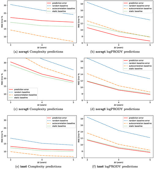 The results for the backtests on this methodology are reported in Figure 7. We predicted the Percentage Compound Annual Growth Rate (CAGR%) for each of the two metrics, and defined the error as , so that if e.g., Complexity increases by 2% and we forecast 3%, . The forecasts are made at timescales years. We used the three datasets hmm6, noreg6 and noreg4. The predictions are not very accurate, with an error between 12% and 6% for logPRODY and in the 32-13% range for Complexity. We compared the predictions to a random baseline, i.e., predicting the displacement by selecting an observed displacement at random from all the available analogues. Compared to the random baseline, SPSb is always more accurate. One peculiarity about the predictions, though, is that they are generally much smaller in magnitude than the actual displacements observed. This led us to add another comparison, which we call static baseline, that consists in predicting zero displacement for all products. Compared to this baseline, SPSb still systematically shows some predictive power for logPRODY, especially in noreg4, but is definitely worse when predicting Complexity. We will clarify our explanation for this behaviour with an analogy. While the average velocity field exhibits laminar characteristics, in the sense that it is relatively smooth, the actual motion of the underlying products is much more disorderly. In a given neighbourhood of the CL plane, products generally move in every direction, often with large velocities, even though the average of their displacements is nonzero and small. We could tentatively describe this as a Brownian motion with a laminar drift given by . So trying to predict the future position of a product from their aggregate motion would be similar to trying to predict the position of a molecule in a gas. That’s why the static prediction is better than a random prediction: in general, the last position of a product is a better predictor than a new random position on the plane, since the new one might be farther away. To test this Brownian motion with drift hypothesis, we added a third baseline, which we call autocorrelation baseline. It consists in forecasting the displacement of a product to be exactly equal to its previous observed displacement. If the hypothesis is true, we expect each product displacement to be uncorrelated with its displacement at previous time steps. For logPRODY the autocorrelation baseline is always worse than the static, which we interpret as a signal that logPRODY changes are not autocorrelated. The reverse is true for Complexity: in fact, for noreg4 and hmm6 the autocorrelation baseline is the best predictor for Complexity change.