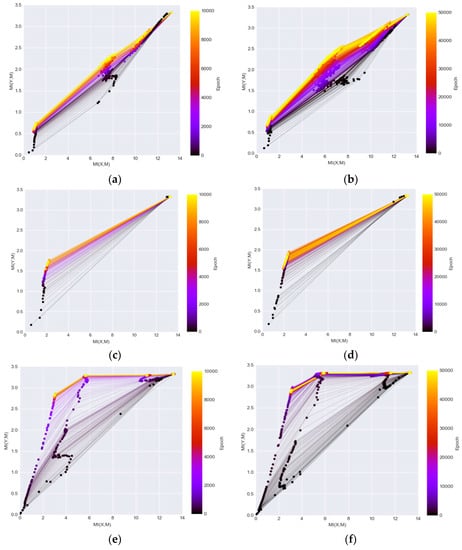 Figure 4 illustrates the information planes of the three DL networks. The left column shows the MI changes over 10,000 iterations and the right column shows the MI changes over 50,000 iterations. The figure demonstrates clear patterns how MI values of individual layers change in each network during the training. After the transformation of data through the networks, the final converged MI value in the last layer of DenseNet (Figure 4e,f) is higher than the MI values in the corresponding layers in the other two networks (Figure 4a–d). The higher MI values indicate that the representations extracted from the network are more informative to interpret the classes. The observation confirms the findings that the DenseNet outperforms both the LeNet and ReLU-MLP [15]. It demonstrates that the MI values magnify the performance discrepancies between models as compared to mere accuracy scores shown in Figure 2b. In addition, the DenseNet is a better architecture for preserving useful information across layers/blocks. Furthermore, neither of the networks is guaranteed to converge by running 10,000 iterations that has been used as a default setting in many studies [9] as the MIs have a noticeable increase level when running 50,000 iterations.