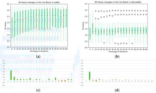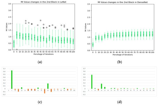 The box plot of the MIs in the second blocks of the two networks are illustrated in Figure 8. In the LeNet, an increasing trend of MIs during the training process is not obvious, except in the very early stages of training, which is contrasted to the first block of the model (see Figure 5a). Indeed, the overall MI values tend to decrease toward the end of training. In the DenseNet, the overall MIs from the dense block of the DenseNet increase consistently and significantly (median value from 0.46 to 1.07). It indicates that the dense block learns representations that share more information with the final output. In addition, these kernels complement one another to keep high MI values for the following blocks (illustrated in the information plan visualization in Figure 4). From the average MI change plots (Figure 8c,d), it confirms the stableness during the evolution of the DenseNet.