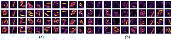 The MI guided DenseNet activation maps after the first convolutional block: (a) the activation maps of the digits with the 4 kernels which have highest MI values; (b) the activation maps of the digits with the 4 kernels which have lowest MI values.