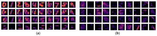 The MI guided LeNet activation maps after the first convolutional block: (a) the activation maps of the digits with the 4 kernels which have highest MI values; (b) the activation maps of the digits with the 4 kernels which have lowest MI values.