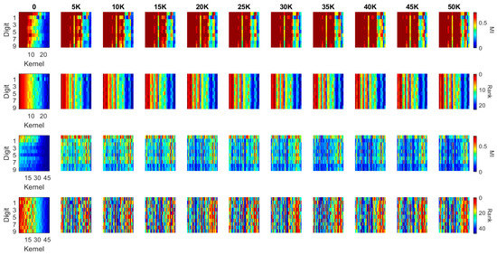 The kernel MI calculated based on the 10 classes in the previous section illustrates the overall evolution pattern of the kernels in both the LeNet and the DenseNet. Another useful approach to calculate the MI values is setting the output (Y) to a binary flag to indicate how individual kernels contribute to the recognition of each digit (i.e., Y = 1 if the image contains such a digit; Y = 0 if the image contains another digit). In this case, the MI value between each kernel and the label ranges in [0, 1]. For each kernel in the first two blocks of the LeNet and the DenseNet, we calculated this MI value for each of the ten-digit classes (0–9) at every 5000 iterations during training (see Figure 9 and Figure 10). We used a heat-map, a popular visualization tool for identifying data patterns, e.g., [40,41,42], to visualize the evolution pattern for each kernel for each digit class. In these figures, each panel represents the “absolute” MI values (first and third rows) and the rank orders (second and fourth rows) of the kernels according to the “relative” MI values for a digit class. The absolute MI values for each digit class represents the correlation between a kernel activation and the model output when a given digit class is presented to the model, and a high correlation between a kernel and the model output indicates that the kernel activation represents some features of the digit class and contributes to the classification; a low correlation indicates that the kernel activation is less relevant to the eventual output and does not contribute to the classification much. The rank order (based on the relative MI values across different kernels in a given block) represents the degree to which a given kernel may contribute to the classification in relation to other kernels. By observing these values over iterations, it is possible to infer whether the kernels would become specialized to specific digit classes or features of digit classes over training. If the kernels would be specialized to a specific digit class or features of a digit class, then the absolute MI value would become higher for a digit class but lower for other digit classes over time. In a similar manner, the rank order of a kernel should change over time in such a way that the rank increases for a digit class but decreases for other digit classes over training. We applied this visualization techniques to individual kernels in the first two convolutional/dense blocks in the LeNet (see Figure 9) and the DenseNet (see Figure 10). In each panel, the horizontal axis represents individual kernels, and the vertical axis represents 10-digit classes (0–9).