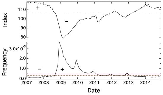 First, we introduced an algorithm that chooses the words with similar patterns and trends in the time series of frequency. Specifically, as shown in Figure 2, we gave a “+” sign if the value is greater than the median of the time series, while we used a “−” sign if the value is smaller. There were four patterns with respect to both values of CI and word frequency, which are greater or smaller than the median: (CI, word frequency) = . If we find more frequency of and than and , CI and word frequency have positive correlation. Alternatively, if and appear more often than and , the two time series have negative correlation. Using the number of appearances of as , we define p as no correlation degree.