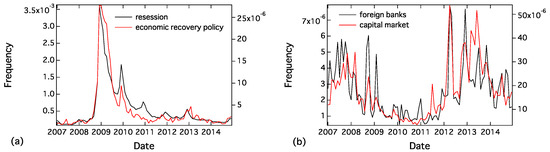 Figure 3 shows an example of the grouping results. We can observe the time series of pairs: for example, “” (recession) and “ ” (economic recovery policy), and “ ” (foreign banks) and “ ” (capital market) are comparable. After the grouping process, we classified the 416 words into 43 groups whose representative words have the lowest p in the group.