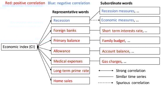 The relationships between variables: (i) economic index and words; and (ii) representative words and subordinate words as a result of analyses: extraction of words by one-body correlation, grouping and round robin (detection of spurious correlation).