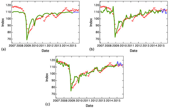 Regression results using the following word frequencies: (a) recession (one word), (b) recession, foreign banks and primary balance (three words), and (c) recession, foreign banks, primary balance, allowance, medical expenses, long-term prime rate and home sales (seven words). Training period was from January 2007 to December 2014 (green line) and test period was from January 2015 to October 2015 (blue line).