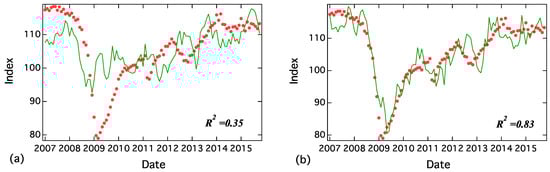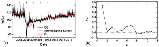 where and the coefficients () are shown in Figure 9b. It has a large weight in a small k and it has a small peak at . We considered it a weekly period, and it almost converged to 0 around . Comparing and (Figure 9a), we found that sudden peaks are reduced in the case of , and it fluctuates around the monthly economic index (CI).