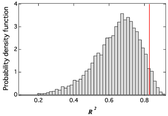 Figure 7 shows the probability density function of for 10,000 samples by the regression of seven random walks. The red line in this figure shows the result in Figure 5c. The results in Figure 5c had a greater value compared to the random walks in most cases, and the probability of the random walks model having a higher was approximately 3%.