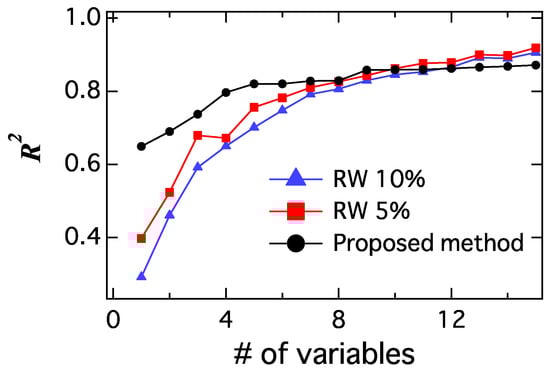 Using the distribution of by the random walk regression, we performed a statistical test. The null hypothesis is the following: “The random walks regression is more effective than the regression by the time series of selected words with respect to ”. Figure 8 shows the relationships between the coefficient of determination (), the number of explanatory variables in the proposed model, and the random walk model with the Top 5 and 10 percentiles. The values of the coefficient of determination increases with respect to the number of explanatory variables. In this case, the of the proposed method was higher than the case of the Top 5 percentile of the random walk model until seven variables. This means that the null hypothesis was rejected with a significant level of 5% and proposed model was better than the random walk model statistically. However, in the case of more than eight variables, the null hypothesis with a significance level of 5% was not rejected. Therefore, we considered the proposed method with seven variables appropriate. The number of explanatory variables is determined as