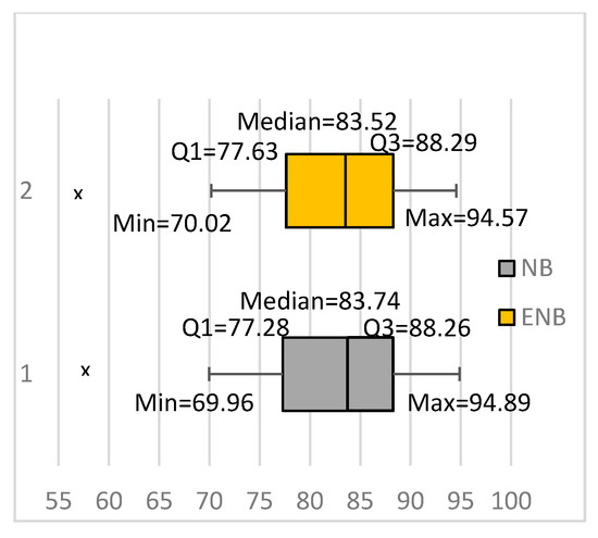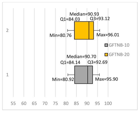 Our results also showed a substantial increase in the average classification accuracy of the FTNB algorithm compared to the NB algorithm. The average classification accuracy of the FTNB and NB algorithms were 85.14% and 81.98%, respectively. Furthermore, comparing the box plots for NB (Figure 1) and FTNB (Figure 2) showed that the FTNB had higher values for the minimum value, first quartile, median, and third quartile. The only exception was the maximum value, where FTNB had a slightly lower maximum value. Comparing the first quartiles of the two algorithms showed that 75% of the data sets had accuracies above 77.28% and 79.02% using NB and FTNB, respectively.