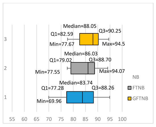 Figure 3 summarizes our results using a box plot for each of the three algorithms: NB, FTNB, and GFTNB. It can be easily seen that the GFTNB algorithm had a higher minimum value, first quartile, median, and third quartile than the NB and FTNB algorithms. The NB algorithm had a slightly higher maximum value than the two fine-tuning algorithms. Comparing the medians of NB, FTNB, and GFTNB, showed that 50% of that data had an average accuracy above 83.74%, 86.03%, and 88.05%, respectively. Similarly, comparing the third quartiles showed that 25% of the data sets had a classification accuracy above 88.26%, 88.70%, 90.25%, using NB, FTNB, and GFTNB, respectively. All these results indicated that the proposed GFTNB outperformed FTNB and NB for text classification.