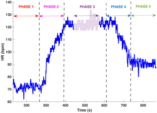 Heart rate (HR) measure belong to an asymptomatic orthostatic intolerance (OI) participant during 6 min walk distance (6MWD) test. The five phases analyzed are showed, all of the with the same data length, it is highlighted during the Phase 3.