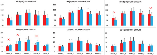 Mean and standard deviation for cardiac output (CO) and HR in the male (left), female (middle) and both gender (right) symptomatic OI participants (red) and asymptomatic OI participants (blue) (X symbol p < 0.05).