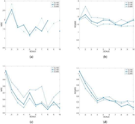 Taking into account the properties of our datasets, the data length and the superiority of FuzEn over SE, and RCMSE over MSE, we employed RCMFE in this study, with , and scales from 1 upto 5. The configuration of the RCMFE with these parameters was based on and supported by the results derived from previous works [17,23,30,31].