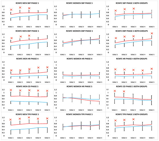 RCMFE analysis from systolic blood pressure (SBP), dyastolic blood pressure (DBP), heart rate (HR) and total peripheral resistance (TPR) in the (left), females (middle) and both gender (right) symptomatic OI (red) and asymptomatic OI participants (blue) along the time scales 1, 2, 3, 4 and 5 (X symbol = p < 0.05).
