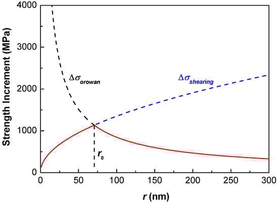 The variation tendency of yield strength increment with the particle size [1,2,3], in which the strength increments caused by dislocation shearing mechanism (Δσshearing) and bypassing mechanism (Δσorowan) are shown, and the maximum increment reaches at a critical particle size r0.