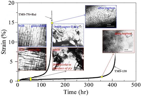 Creep curves at 1100 °C/ 137 MPa of TMS-75(+Ru) and TMS-138 superalloys, in which the microstructures at different creep stages (primary stage, steady state and after rupture) are also presented [40].