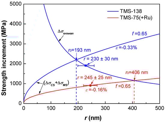 The variation tendency of (ΔσCS + ΔσMS) and Δσorowan with the particle size r of TMS-138 and TMS-75(+Ru) superalloys, in which the optimal particle size r0 from the calculation and the experimentally-measured r are also marked for each alloy.
