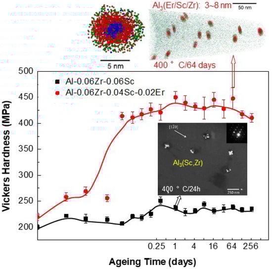 Variation of Vickers hardness of Al-Zr-Sc-Er alloys with the aging time at 400 °C, in which the precipitate morphologies of coherent Al3(Sc,Zr) after aging 24 h and Al3(Sc,Zr,Er) after aging 64 days are also presented [50].