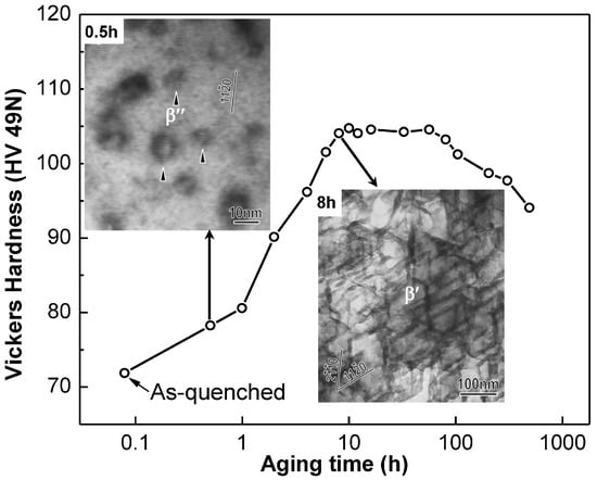 Variation of Vickers hardness of the Mg-15Gd-0.5Zr alloy with the aging time at 250 °C, in which the morphologies of coherent β″ and β′ precipitates are also shown [72,73].