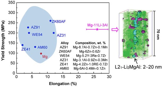 Comparison of the mechanical properties (yield strength and elongation) of the BCC-based Mg-11Li-3Al alloy in traditional HCP Mg alloys, in which the spherical L21 nanoparticles of the former BCC Mg alloy are also presented [74].