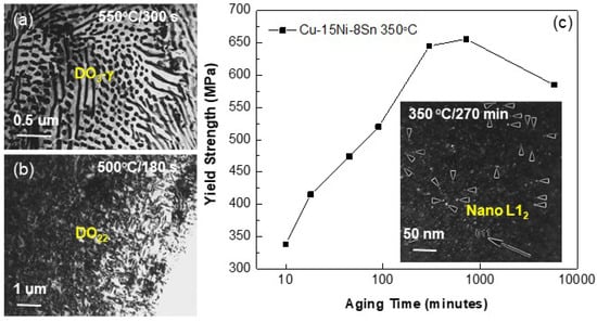 The precipitates in various Cu alloys generally show different phase structures, in which the coherent precipitation of metastable ordered L12 in the FCC-Cu solid solution matrix can appear in the commonly-used Cu-Ni-Sn alloy system [75,76,77]. The model alloy is the Cu-15Ni-8Sn (wt.%, C72900), in which the (Cu,Ni)3Sn precipitates have four crystal structures, FCC-DO3, tetragonal DO22, ordered L12, and orthorhombic δ. The phase evolution sequence from high to low temperatures is similar to that in aged Al alloys for different times. When aging at above 550 °C, discontinuous and intragranular DO3-γ precipitates (plate-like shape) appeared in the FCC matrix, as seen in Figure 9a. Spinodal decomposition often occurred during the early stage of the decomposition below ~500 °C, followed by the DO22 ordering (as seen in Figure 9b) and then L12 ordering (the inset of Figure 9c) [77]. With decreasing aging temperature, spherical L12 nanoparticles could be coherently-precipitated into the FCC matrix, compared with the rod-like DO22 precipitates. The particle morphology can affect the mechanical property of this alloy, as seen in Figure 9c, being the variation tendency of the tensile yield strength with the aging time [77,78,79]. It was found that the coherent precipitation of spherical L12 nanoprecipitates corresponds to the highest strength.