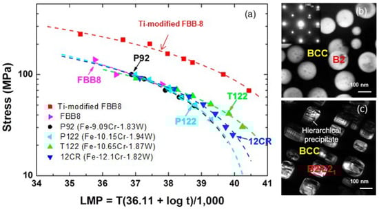 (a) Larson-Miller parameters (LMP) for FBB8, Ti-modified FBB8, and several conventional steels (P92, P122, T122, and 12CR) [89]; (b,c) morphologies of spherical B2 nanoprecipitates in FBB8 [12] and cuboidal L21 nanoprecipitates in Ti-modified FBB8 [89,90], respectively.