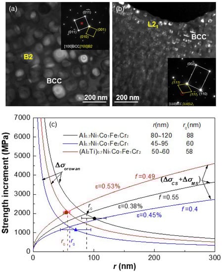 Computations of (ΔσCS + ΔσMS) and Δσorowan as a function of particle size r for the present Al0.7Ni1Co1Fe1Cr2, Al0.7Ni1Co1Fe2Cr1, and (Al2Ti)0.7Ni1Co1Fe1Cr2 HEAs (c), in which the morphologies of the coherent cuboidal B2 (a) and L21 (b) precipitates are also presented [107,108,120]. The optimal particle size r0 from the calculation and the experimentally-measured r are also marked for each alloy.