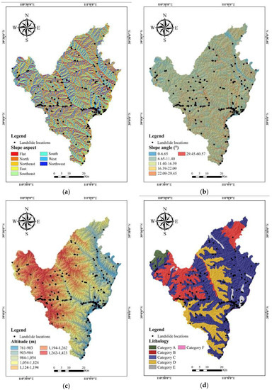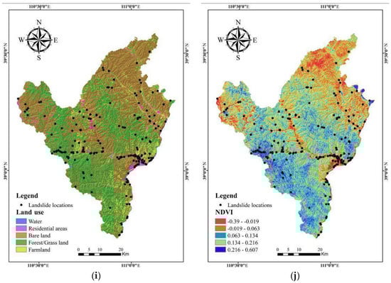 Landslide explanatory variable maps involving: (a) Slope aspect; (b) slope angle; (c) altitude; (d) lithology; (e) mean annual precipitation; (f) distance to roads; (g) distance to rivers; (h) distance to faults; (i) land use; (j) normalized difference vegetation index (NDVI).