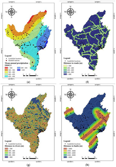 Fault movement is not only the requirement for individual landslide occurrences, but also a controlling factor for regional landslide occurrences [12]. A mass of field surveys indicated that the more fault movement occurred acutely, the more landslides were triggered. In the current research, with 2000 m as the interval, the values of distance to faults were reclassified into five ranges based on equal interval method as follows: <2000 m, 2000–4000 m, 4000–6000 m, 6000–8000 m, and >8000 m (Figure 2h).