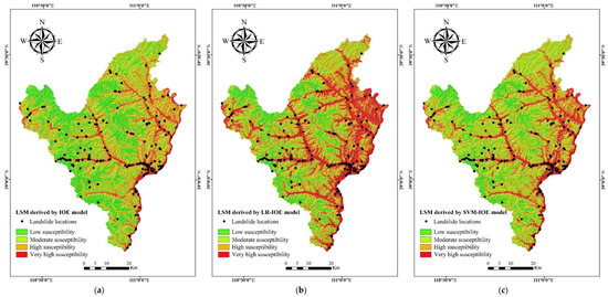 Landslide susceptibility map derived from: (a) The IOE model; (b) logistic regression (LR)–IOE model; (c) support vector machine (SVM)–IOE model.