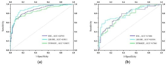 In the end, for success rate results, the AUC values for the IOE, LR–IOE, and SVM–IOE models were observed to be 0.8743, 0.9011, and 0.8653, respectively (Figure 4a). That is to say, the training accuracy of the susceptibility maps is 87.43%, 90.11%, and 86.53%, respectively. In terms of prediction rate results, the AUC values for the IOE, LR–IOE, and SVM–IOE models were found to be 0.7686, 0.8184, and 0.7661, respectively (Figure 4b). In other words, the prediction accuracy of the susceptibility maps is 76.86%, 81.84%, and 76.61%, respectively.