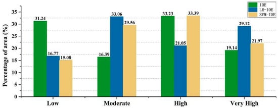In terms of the proportion of the final susceptibility mapping results (Figure 5), it can be observed that the proportion of high and very high regions obtained by the three models is about 52%. Among them, the LR–IOE model has the lowest result (50.17%), which implies an efficient result corresponding to the LR–IOE model, and it can also improve the efficiency of decision-making and reduce costs.