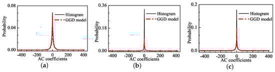 The GGD model, as a typical NSS model, is widely used to fit distribution of AC coefficients in the DCT domain for natural images [], and it can well simulate non-Gaussian behaviors, including sharp-peak and heavy-tail phenomena of the distribution of AC coefficients of natural images [,,].