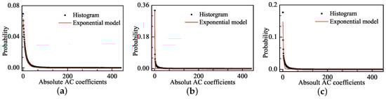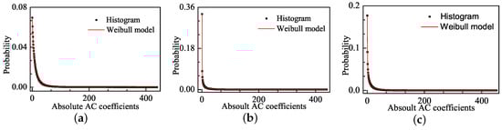 where  is the value of the histogram for the absolute values of AC coefficients, and  is the statistical distribution density of the fitting functions. The MSE values for Weibull model are  and  in Figure 4b,c, respectively, and these values are much lower than the MSE values of the GGD model, which are  and  in Figure 2b,c, respectively.