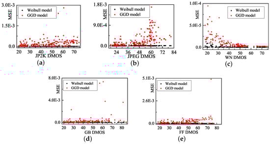 We also develop a Weibull model that fits five representative distortion types in the LIVE database: JP2K compression (JP2K), JPEG compression (JPEG), white noise (WN), Gaussian blur (GB), and fast-fading (FF) channel distortions []. Figure 5 presents the MSE comparison of two models for each distortion type images. Table 1 lists the average MSE of each distortion type. The fitting error of the Weibull model is obviously smaller than that of the GGD model. Therefore, the Weibull model is employed to evaluating the image quality in this paper.