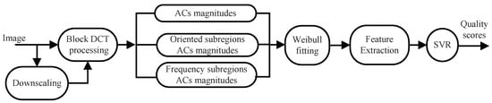 In this section, we describe the proposed BWS method in detail. The framework is illustrated in Figure 6. First, block DCT processing is applied to images of different scales. The goal is not only to conform to the decomposition process of local information in the HVS [] but also to reflect the image structure correlation []. In the DCT domain, the magnitudes of the block AC coefficients and those in the orientation and frequency sub-regions are extracted to describe HVS characteristics. Then, a Weibull model is employed to fit these values. From the Weibull model, the following four perceptive features are extracted: the shape-scale parameter feature, the coefficient of variation feature, the frequency sub-band feature, and the directional sub-band feature. Finally, by using the SVR learning method, the relationship between the image features and subjective quality scores in high-dimensional space is obtained.