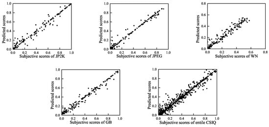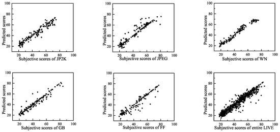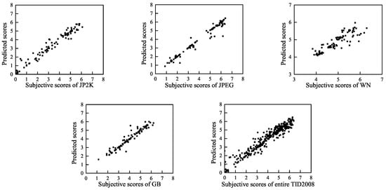 Previous research has demonstrated that the incorporation of multi-scale information can enhance the prediction accuracy []. The statistical properties of a natural image are the same at different scales, whereas distortions affect the image structure across different scales. The perception of image details depends on the image resolution, the distance from the image plane to the observer and the acuity of the observer’s system []. A multi-scale evaluation accounts for these variable factors. Therefore, we extracted 24 perceptual features across three scales. In addition to the original-scale image, the second-scale image was constructed by low-pass filtering and down-sampling the original image by a factor of two. Then, the third-scale image was obtained in the same way from the second-scale image. As listed in Table 8, each scale includes eight features. The extraction process is as described in Section 3.2, Section 3.3, Section 3.4 and Section 3.5.