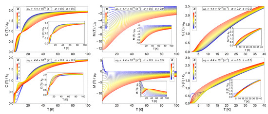 Upper row: Specific heat, magnetization and entropy for a quantum dot without intrinsic spin for our numerical calculations using the parameters and in Equation (6). The inset images correspond to the exact calculations obtained in the Reference [41] for the same observables. We clearly observe a very good convergence of numerical results. Lower row: Specific heat, magnetization and entropy for the case of antidot with and . The inset images correspond to the exact calculations obtained in the Reference [41] for the case of an electron in a dot with an intrinsic spin. We observe here similar behaviour at low temperatures for the thermodynamics observables displayed. Therefore, for the thermal observables, the inclusion of AB-flux in an antidot shows similar behaviour as a function of temperature as compared to the case of an electron trapped in a quantum dot with intrinsic spin.