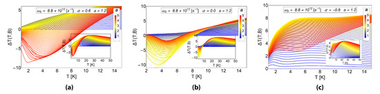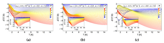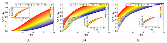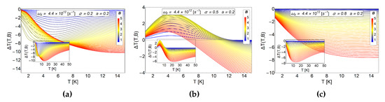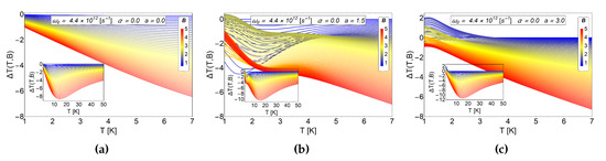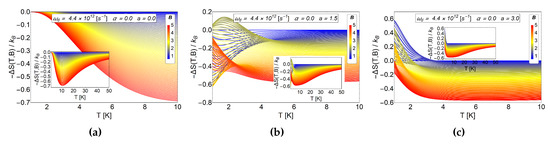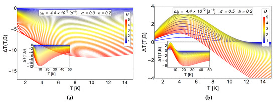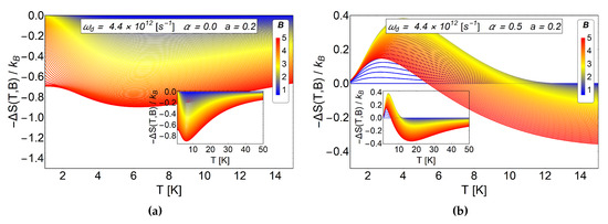 For the entropy grows with the magnetic field, therefore, by calculating − with we obtain negative values. This result is expected due to the strong degeneracy of the Fock-Darwin levels reflected in the dependence of the spectrum of Equation (7) in the azimuthal quantum number m. When a starts to increase, the entropy shows an interesting behaviour for low values of T, specifically, between 0.1 K to 7 K for (b) panel of Figure 4 also for the values 0.1 K to 3 K for the panel (c) of the same figure. These regions show crosses for low and intermediate values of the external magnetic field and thus giving a way to obtain − (with ). Therefore, a direct magnetocaloric effect can be obtained in that region. For higher temperatures than those mentioned before, we always found a negative and a MCE inverse is recovered. We recall that a parameter is associated with which can be modified due to experimental set-up. So, this oscillatory type of MCE can be controlled in an experiment. From Figure 4c, we observe that the positive part of increases notoriously for , so we expect greater value for at low working temperature for this set of values. To explore if this effect is enhanced due to an increase in the a parameter, we plot as a function of T for larger values of antidot radii. In Figure 5, we see that the direct MCE effect for (left panel (a)) and (right panel (b)) vanishes and we only get . Therefore, we expect negative for all temperature region, thus obtaining an inverse MCE solely. To obtain oscillatory behaviour in the MCE, the optimal region of the a parameter for the antidot with zero AB-flux, is in the interval .