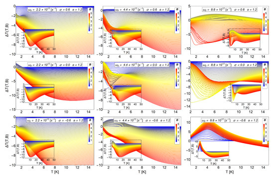 In the two previous subsections, it was shown that the antidot radius and the AB-flux could be used to control, in the low-temperature range, an oscillation in the MCE of direct-inverse type. In addition, we observe that an increase of the parameter does not produce necessarily an increase in the positive peak in the MCE. In the case of the modification of the a parameter (antidot radius), the does not increase significantly for significant variations of the parameter, and even the oscillation in the MCE tends to disappear for . Therefore, to have control of the magnetocaloric response in the system, it is important to find a suitable parameter set, (, a and ), that allows us to drive the MCE. Next, in Figure 11, we present results by varying the dot frequency, keeping fixed the antidot radius and for the three cases of AB fluxes, positive, negative and zero.