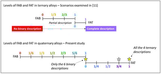 The possible values of the fraction of assessed binaries (FAB) and fraction of assessed ternaries (FAT) quantifying the fraction of binary/ternary descriptions assessed within a database for ternary and quaternary alloys. FAB = 1 and FAT = 0 represents partially assessed conditions, while FAB = 1 and FAT = 1 represents fully assessed conditions.
