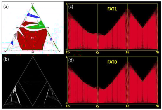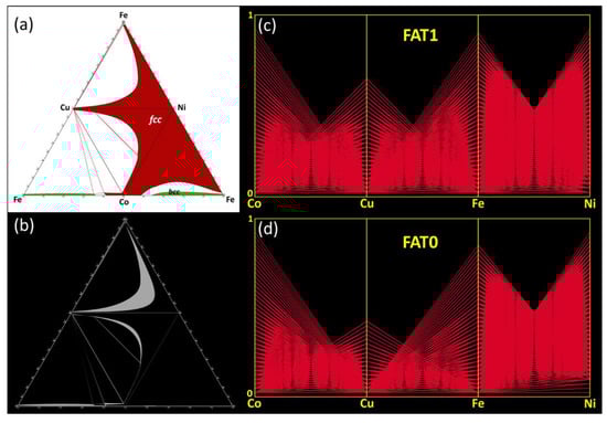 The effects from canceling ternary interactions are slightly different for the Co-Cu-Fe-Ni (Figure 4). This system contains disordered fcc and bcc phases and no intermetallic phases (Figure 4a). The calculations with FAT = 0 correctly predict the presence and location of these phases. Perfect match of FAT = 0 and FAT = 1 calculations occurs for the Co-Fe-Ni ternary, similar to the previous case with the Co-Cr-Fe-Ni system. However, the main disagreement between the FAT = 0 and FAT = 1 calculations arises from incorrect predictions of the miscibility gap boundaries for the high-temperature fcc phase in the Co-Cu-Ni and Cu-Fe-Ni ternary subcomponents (Figure 4b) and in the quaternary volume (Figure 4c,d). The absence of ternary interactions incorrectly shifts the miscibility gap boundaries toward higher concentrations of Ni, while the presence of these Ni-associated ternary interactions expands the high-temperature fcc phase to higher concentrations of Cu and Fe or Co and Cu (Figure 4b–d). Due to this, only 63% of the fcc phase points calculated from FAT = 0 match the FAT = 1 calculations, while almost 100% agreement occurs for the bcc phase fields (Figure 3).